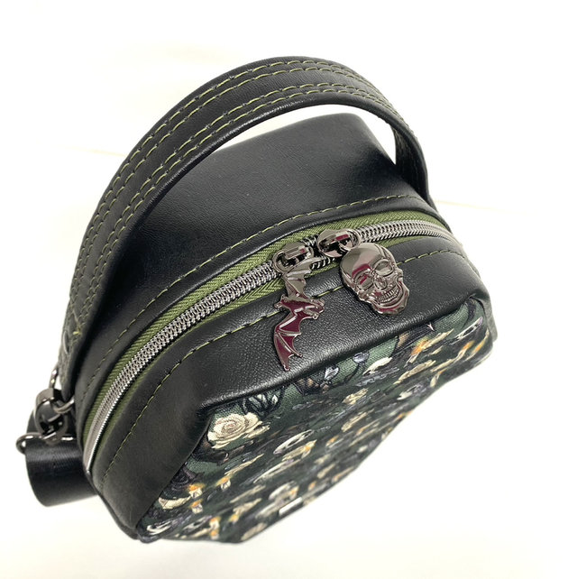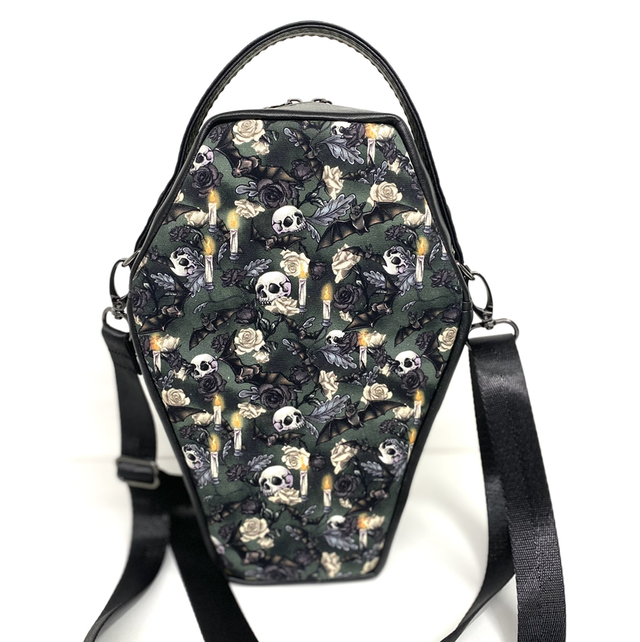Handmade faux leather/cotton canvas crossbody handbag. This bag features a skulls, bats and candles design, interior slip pocket and ample space to carry your essentials. Includes a top handle and the adjustable strap ensures a comfortable fit either on shoulder or across body.