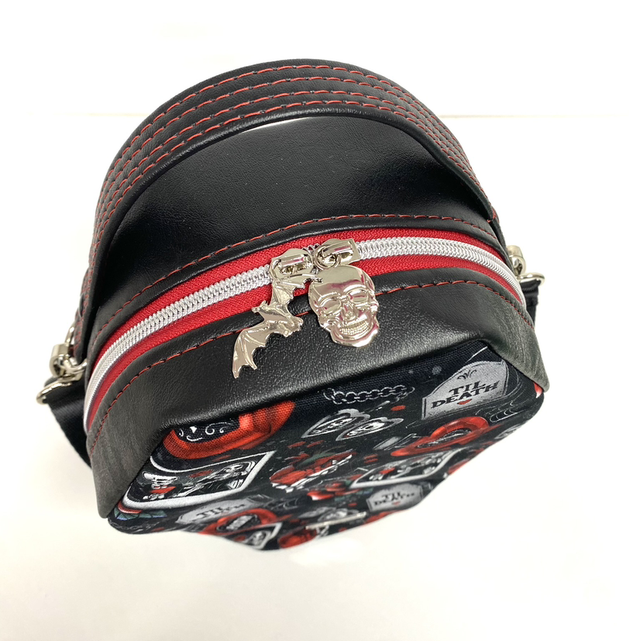 Handmade faux leather/cotton canvas crossbody handbag. This bag features a Til Death design, interior slip pocket and ample space to carry your essentials. Includes a top handle and the adjustable strap ensures a comfortable fit either on shoulder or across body.
