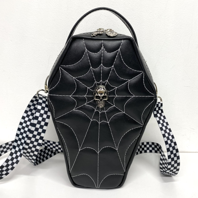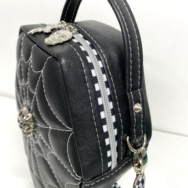 Handmade faux leather crossbody handbag. This bag features a white quilted web design and a 3D skull, interior slip pocket and ample space to carry your essentials. Includes a top handle and the adjustable strap ensures a comfortable fit either on shoulder or across body.