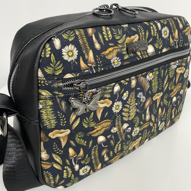 Handmade cotton canvas/ faux leather handbag with an adjustable crossbody strap. The exterior of this bag includes a zip pocket and the interior features both a zip and slip pocket, providing space for all of your essentials.
