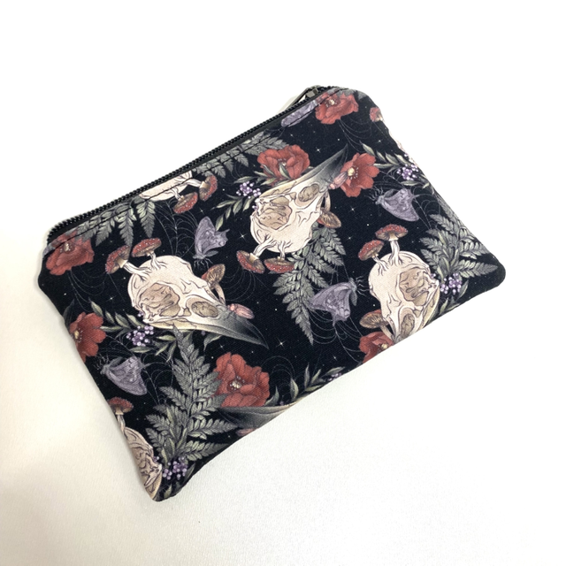 Handmade cotton canvas purse. This purse is designed to hold notes and coins in the top section and cards in the front zip compartment. The size is approximately 6.5 inches in width and 4.5 inches in height.
