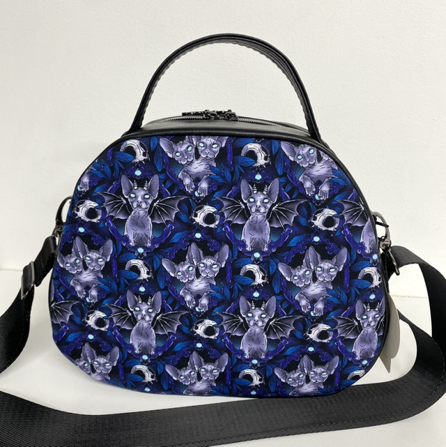 Handmade cotton canvas/faux leather crossbody handbag with both a top handle and an adjustable crossbody strap. The interior of this handbag includes zip and slip pockets, providing space for all of your essentials.