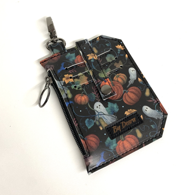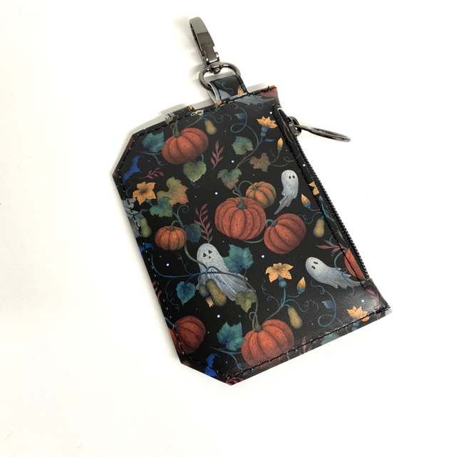 Handmade faux leather purse. Includes 3 card slots with a snap tab closure, a swivel clip and a zipped main compartment.