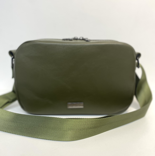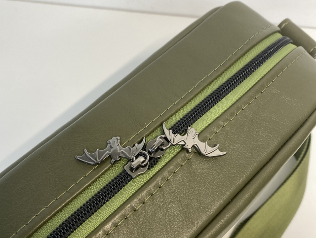 Handmade khaki green leather crossbody bag with a black gloss bat applique design. This bag features an adjustable crossbody strap, interior zip and slip pockets, ample space to keep your essentials organized. Perfect for all occasions.