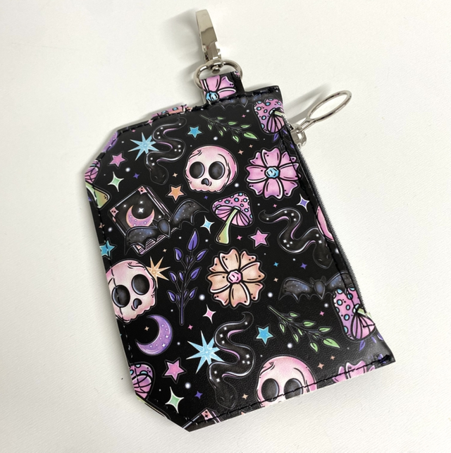Handmade faux leather purse. Includes 3 card slots with a snap tab closure, a swivel clip and a zipped main compartment.