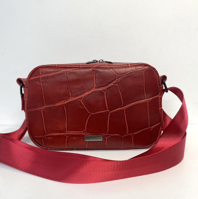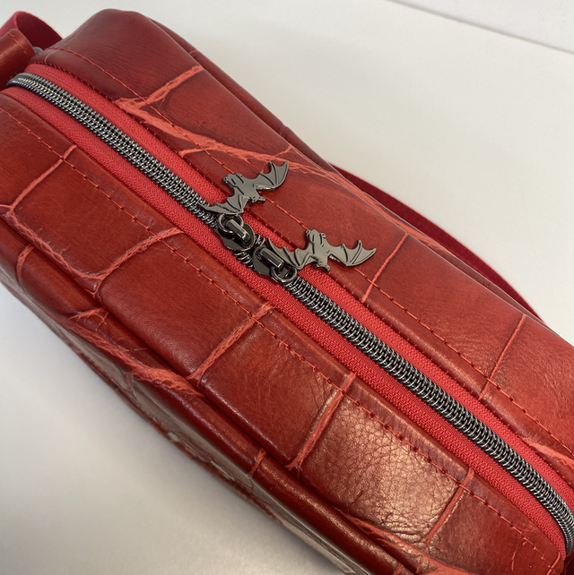 Handmade Red Croc Leather crossbody bag with a black gloss bat applique design. This bag features an adjustable crossbody strap, interior zip and slip pockets, ample space to keep your essentials organized. Perfect for all occasions.