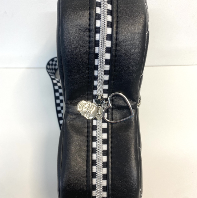 Handmade black faux leather Heart-shaped crossbody bag with a quilted web design and skull feature. This bag has an adjustable crossbody strap, an interior zipped pocket and divided slip pocket with ample space to carry your essentials. The adjustable strap ensures a comfortable fit either on shoulder or across body.