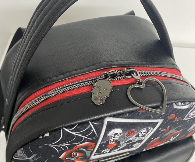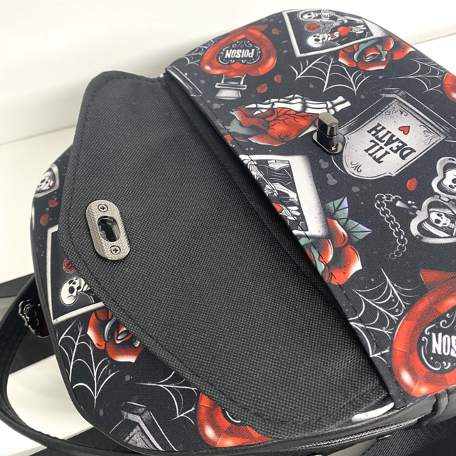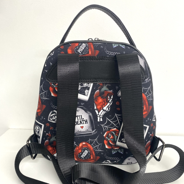 Handmade Til Death design cotton canvas/faux leather Backpack, perfect for carrying your essentials on-the-go. This Backpack features an exterior flap pocket, interior zip and slip pockets, a top carry handle, and adjustable backpack straps, providing easy access to your belongings. This Backpack is ideal for every day use.