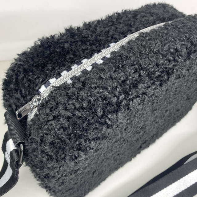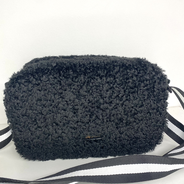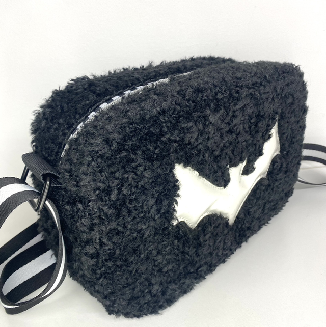 Handmade black curly faux fur crossbody bag with a gloss white bat applique design. This bag features an adjustable crossbody strap, interior zip and slip pockets, ample space to keep your essentials organized. Perfect for all occasions.