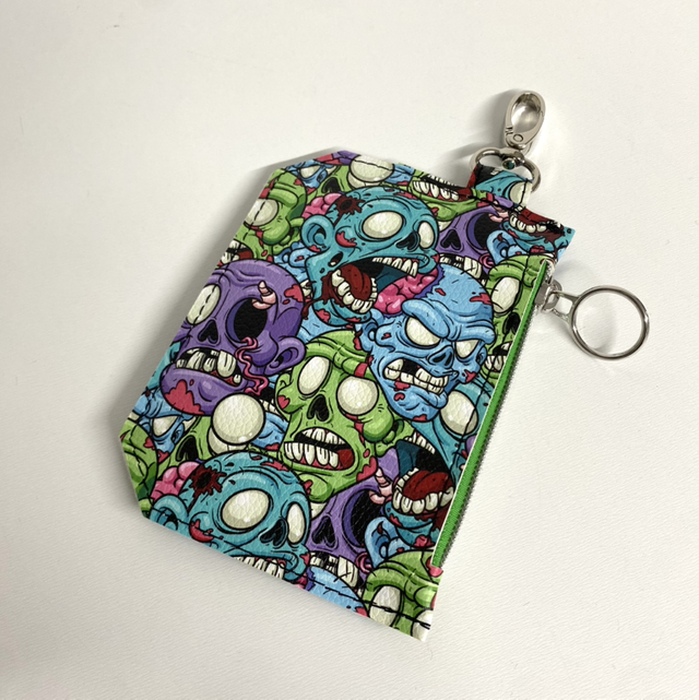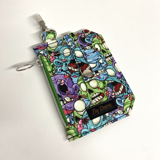 Handmade faux leather purse. Includes 3 card slots with a snap tab closure, a swivel clip and a zipped main compartment.